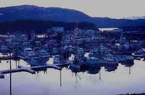 Wednesday 24 May 2000 On the road again! 9 am flight with Randy and Larry from SFO to Seattle and Anchorage, arriving very late. Quick run to a nearby gate for a connection with another Alaska Airlines flight to Cordova, intense argument with the airline gate agent, who insists I check our HDTV camera, which is in a soft carryon case. "That won't fit in the overhead bin and there's no extra room -- the flight is full, sir," I am told. "But, ma'am, this is a $100,000 television camera which is not packed to go in the hold. There's no way......" Fortunately, the flight attendant on the plane comes to my rescue. The flight isn't even half full, despite what the gate agent says, and there's plenty of room. We meet Jon McDonald, who's flown in from Austin, and Kat Brady, our Anchorage-based Production Manager, on board (despite the fact that the same gate agent had told us that they hadn't checked in yet). Short flight to Cordova, a small fishing village on the Alaska coast Southwest of Anchorage. Winter population 1500, summer population about double that. Amazingly, all our gear and luggage has arrived with us, despite the short turnaround in Anchorage. But my poor suitcase, which was previously sullied and soiled by Continental, has now been damaged by Alaska Airlines. The big flat pocket on the side is hanging open and empty. Upon inspection, however, nothing is torn, but the zipper on that pocket has been torn from its seams with great force. Two things missing: a small empty backpack, which arrives on its own later that night, and a short strap used to attach another bag on the side. The airline pays me for the loss of the strap and finds a seamstress in town to stitch up my bag. We check into the Reluctant Fisherman Inn, surely the oddest name I've ever encountered for a hotel. Our rooms have a view of the harbor and the fishing boats right below us. The town is surrounded by snow-covered mountains -- at sea level !! -- yet the temperature is quite temperate. I speak by phone to Greg Kern, our gaffer in Anchorage, who will be coming to Cordova Friday with two grips and our lighting gear. Cordova is only accessible by air and water, so everything must be flown in. Like many places in Alaska, if you're in a car, you can't get there from here. We have salmon for dinner (when in Alaska, after all...) and do some shooting in the harbor before the sunset at 10:42pm! This far north, the days are very long in May (sunrise is at 4:32 am!) and Larry promises to work us 20 hours a day. During our stay at the Reluctant I wake often during the night and go to the window to watch the sky. In the west it stays light for many hours after the nominal sunset. In fact, it never really gets completely dark. I take a shot of the harbor at 11 pm from the window of my room. |