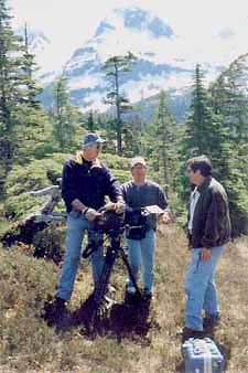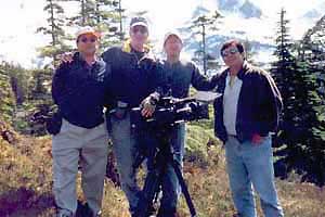 Thursday 25 May 2000 Jon and I shoot flavor shots in town while Randy and Larry meet our interview subjects. We shoot the Alaska Hotel sign (which is, inexplicably, upside down), the Cordova Times, some tulips, license plates, interesting wall textures, cars. Our camera attracts attention in this small town, and people stop to ask what we're doing and to chat. A white-haired man comes up and jokingly demands, "What are you doing in my town?" then introduces himself and proceeds to tell us story after story. One is about his early days in Alaska: he's got some Indian blood, he says, and his Indian name is Falling Rock. When he was younger, he used to go wilderness camping quite a bit. One time he went out into the bush, got lost, and wasn't seen again for some months. Though he survived this ordeal, before he was found, his friends were concerned about his safety and got the State to erect signs about his disappearance. To this day, there are signs all over Alaska that advise passersby to "Watch for Falling Rock." We drive to a cannery outside town, shoot a 270 degree pan from the pier nearby and beautiful scenics of the sky and water and mountains, somewhat enhanced by our color "grad" filters. We are surrounded by snowcapped mountains in every direction. We discuss with Kat the possibility of flying to Tutiklet, an Eyak (native Alaskan) village to shoot some cultural scenes, but the village elder who must approve our visit is in Reno on a brief excursion and we must wait for his return. We return to town and Larry gets a message from Kim that Jon needs to get more passport pictures for his visa for India. Apparently they have mistakenly granted him a business visa (instead of a journalist visa, as we were advised) and thus used up the pictures he had sent. We find a photo place, get the pictures, then head to the airport to send them via Alaska Airlines' Gold Streak service to Kim in California. We drive out the Copper River Highway, the only road out of town. At mile 21, where the road crosses the Alaganik River, we stop to watch men scooping "hooligan" fish by net from the river, a dozen at a time (Later Randy finds out these are bulk-frozen and shipped to the US government for feeding captive marine mammals). We drive another 30 miles to Child's Glacier. On the way we shoot snowcapped mountains ("Majestic," says Larry several times) and drive between 7-foot-tall walls of snow (which were plowed just a few minutes before). The road ends near the glacier at the unusually-named Million Dollar Bridge, which sports a funky repair of a secton which has fallen in. We grab some great shots of the glacier as the light fades (by now it's 9:30 at night). We head back to town, assuming we have missed dinner, but we find an open pizza place and secure pizzas, beer, and salads, which we take back to Jon's room and watch today's footage on our 14" monitor. |